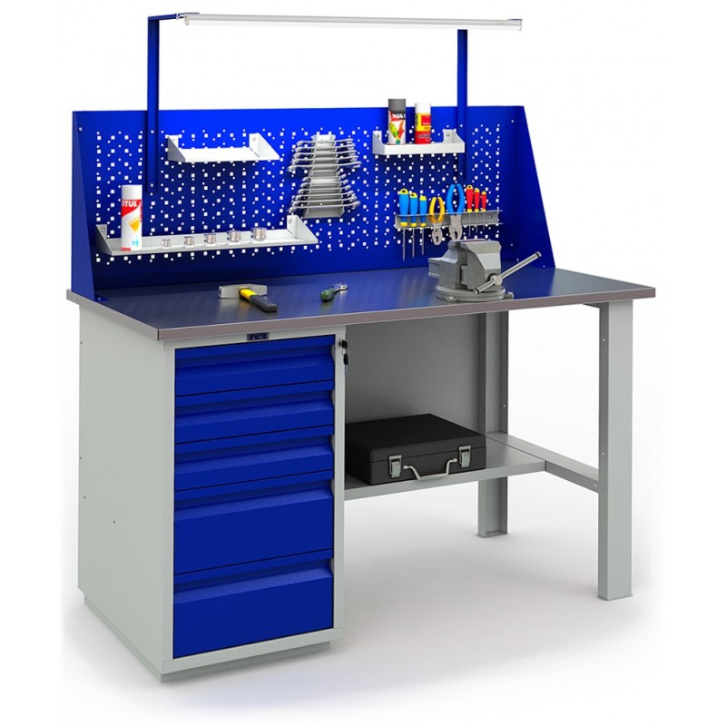 Jedná se o kvalitní dílenský stůl evropské produkce vyznačující se spolehlivostí, vhodný pro velké zatížení. Je odolný vůči mechanickým i chemickým vlivům. Stoly jsou založeny na modulárním principu - dají se kombinovat různé sestavy, zásuvky jsou opatřeny plným výsuvem. Díky těmto stolům máte možnost vytvořit pracovní místa podle individuálních požadavků v souladu s ergonomickou pracovní polohou. Závěsný panel na nářadí je vyrobený z kvalitní oceli a nad ním může být osvětlovací rampa s LED diodami. Deska stolu je vyrobená z MDF tloušťky 24 mm a je zpevněná pomocí pozinkovaného plechu tloušťky 1,5 mm. Dodává se v rozloženém stavu.
